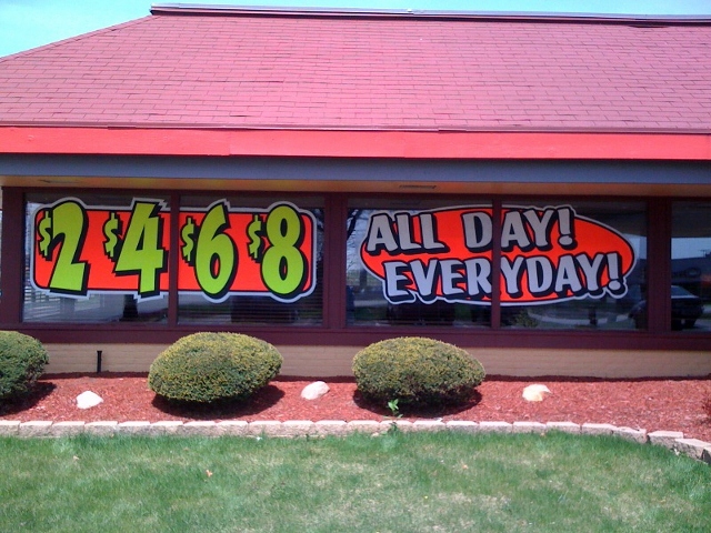 Denny's Restaurants was looking for a way to increase attention for their new ad campaign. They called on Oliver Signs to develop an eye-catching design for their "$5.99 combo" promotion. They confirmed what we already knew...after the promotio nended and they ran the "numbers", we were told that the units that used our ads in the windows had almost DOUBLED the sales of that product! Denny's now incorporates our signs into their national advertising!