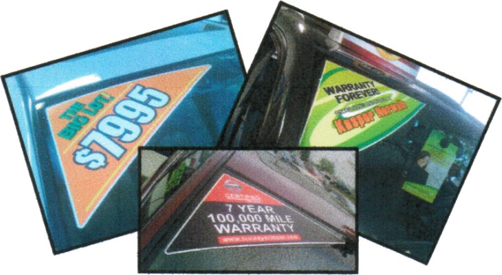 Windshield TrianglesLabel every car on your lot to help inform your customers and provide a uniform professional presentation - custom made to your order! |